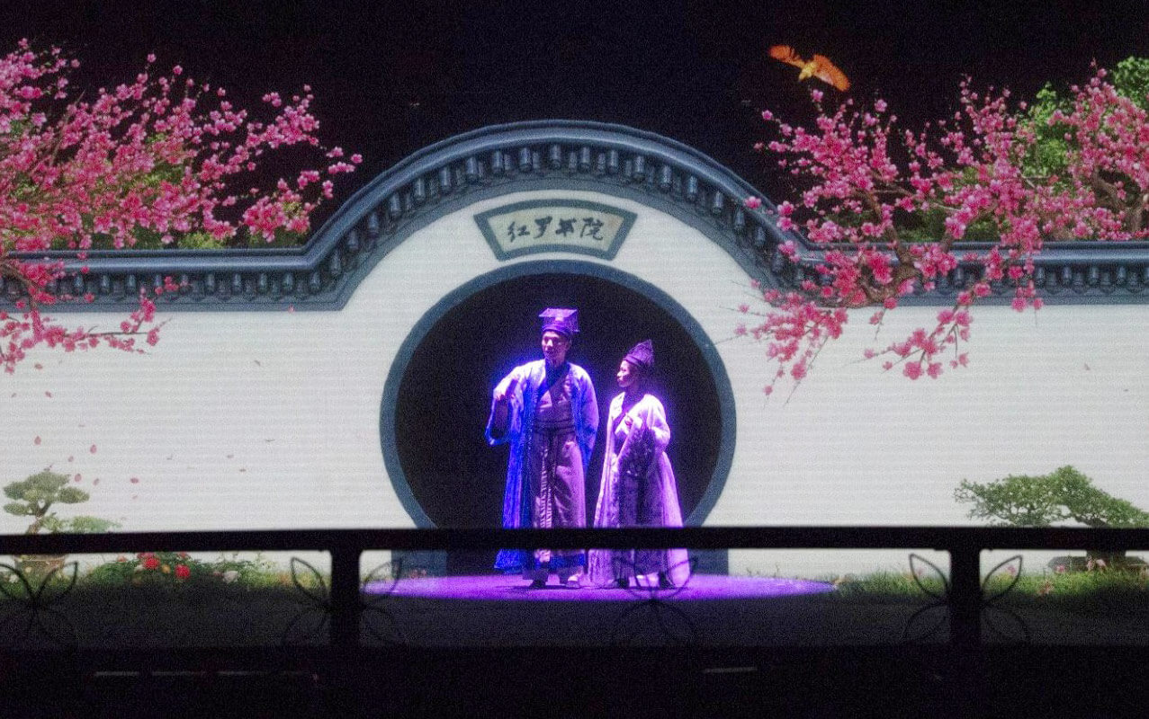 全景式AR環(huán)境影片《梁祝》,打破傳統(tǒng)歌舞劇場(chǎng)的表演形式,把真人表演與幻影成像相結(jié)合。以《梁山伯與祝英臺(tái)》的愛(ài)情故事為基礎(chǔ),精彩演繹祝英臺(tái)女扮男裝上山求學(xué),與梁山伯暗生情愫,最后為追尋真愛(ài)而殉情,兩人雙雙化蝶的經(jīng)典橋段 。實(shí)現(xiàn)了四面墻在通透的舞臺(tái)上憑空出現(xiàn),藤蔓在墻上生長(zhǎng),以及墻面碎裂、崩塌甚至消失等神奇效果。
